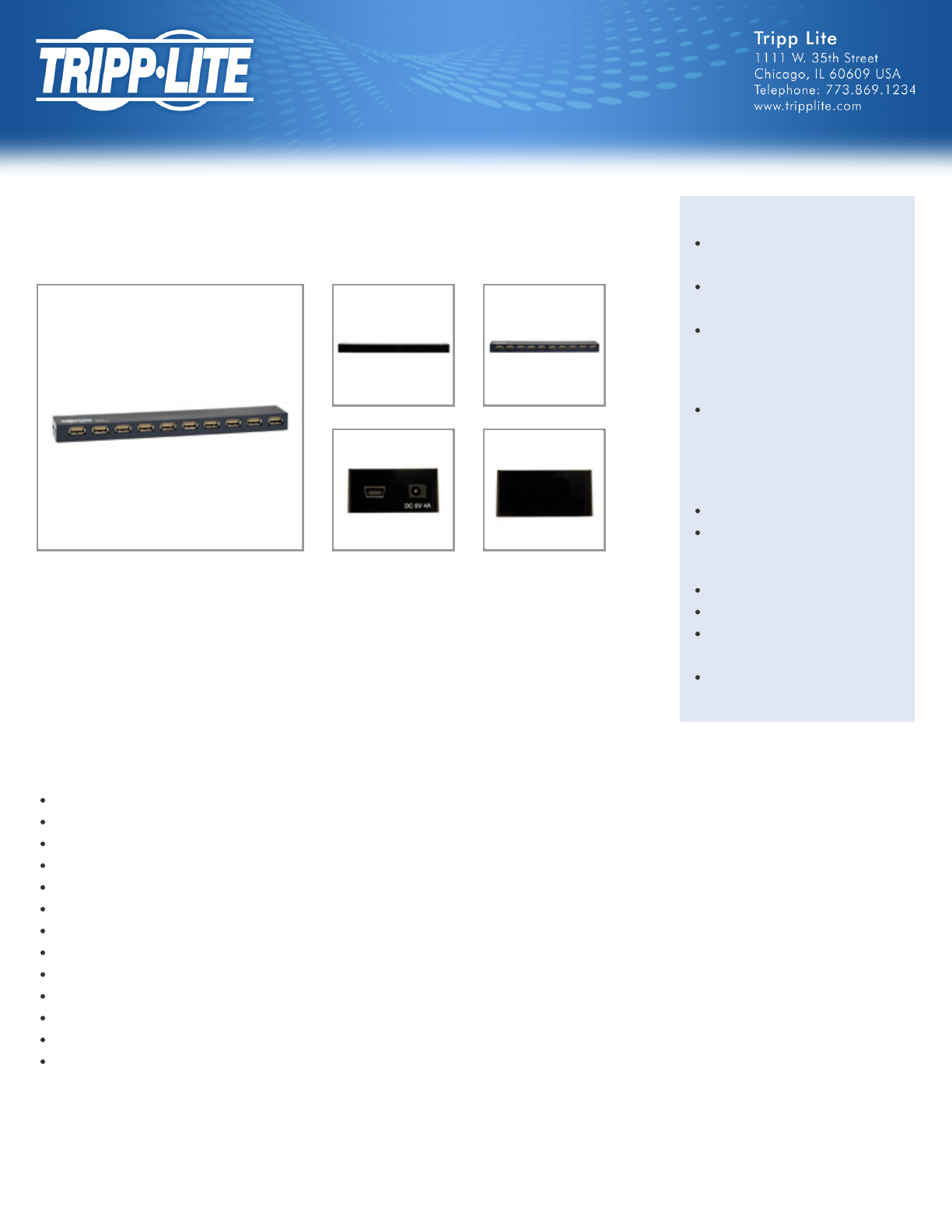 Tripp Lite's U223-010, 10-port USB 2.0 hub is the most versatile and powerful hub on the market. It allows you